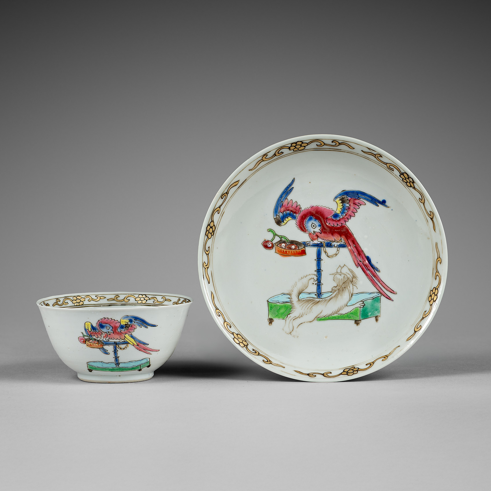 Le bol à thé et la soucoupe sont décorés d’un perroquet sur un perchoir avec une branche de cerises, et d’un petit chien, peints dans
