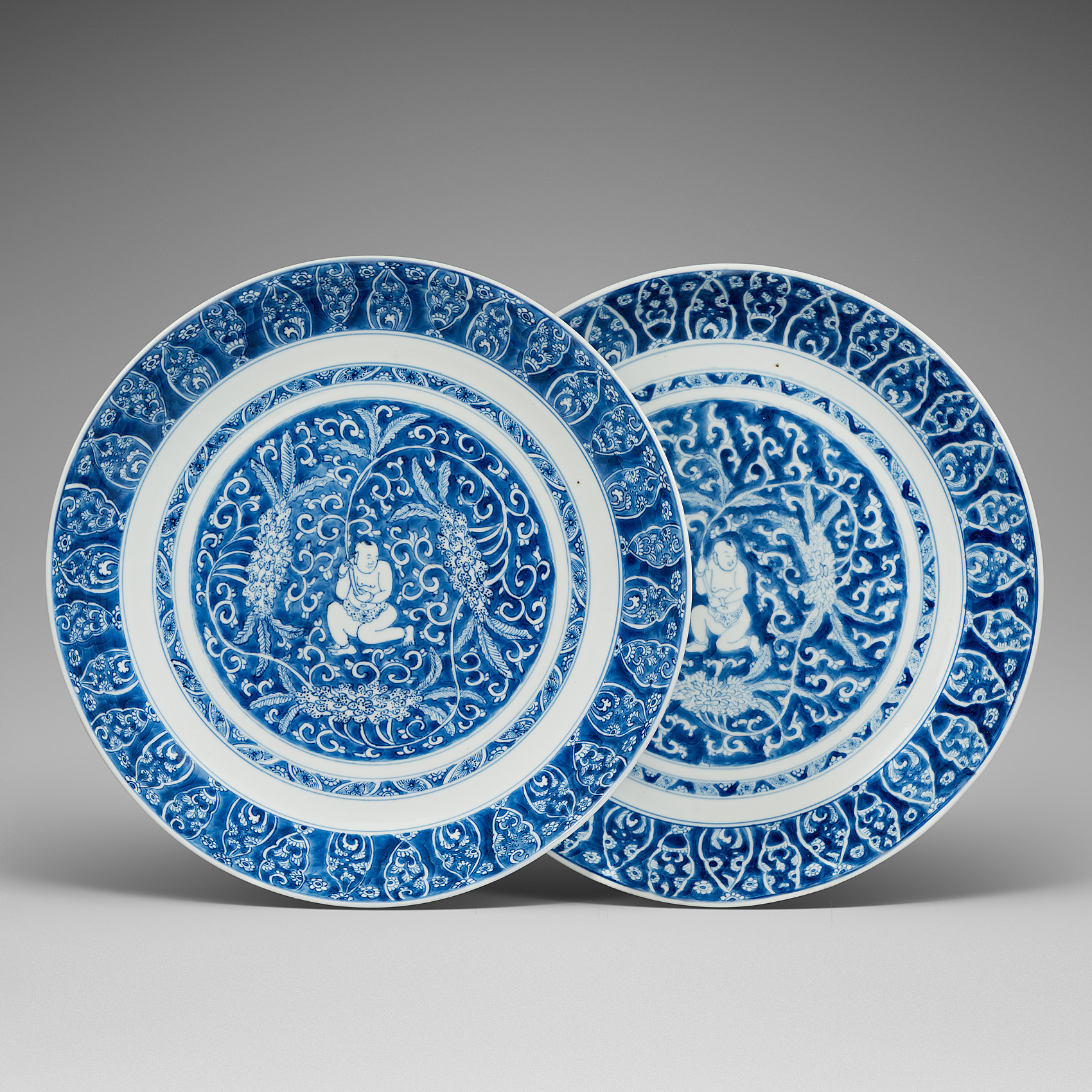 Paire de coupes bleu et blanc « garçon et pivoines ». Chine, Kangxi