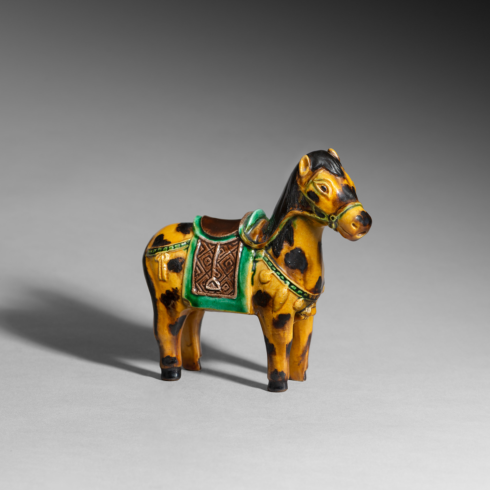 Compte-gouttes en biscuit émaillé en forme de cheval. Chine, Kangxi